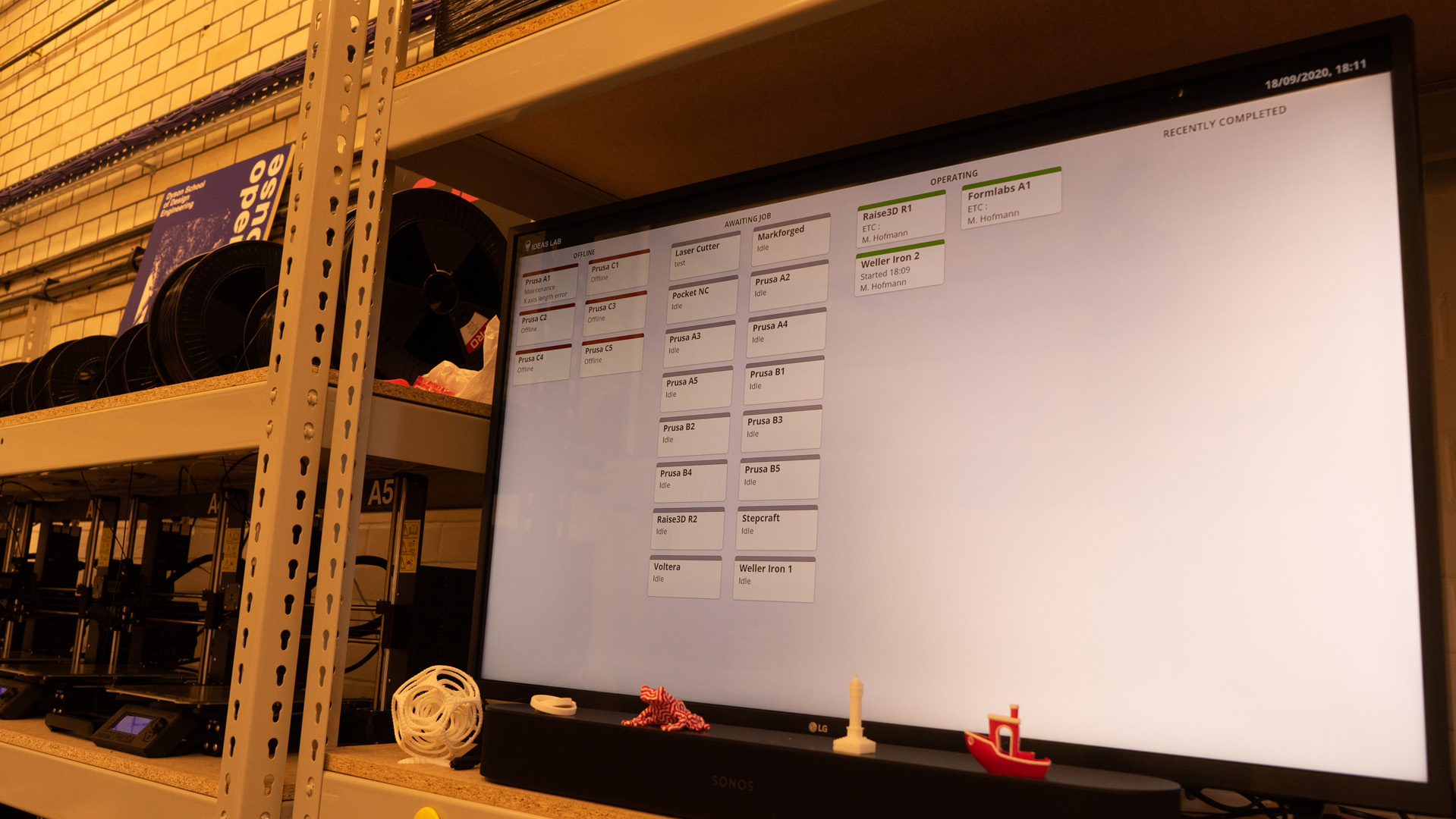New digital manufacturing technologies, such as 3D printing, enable rapid-prototyping of physical ideas earlier in the design process. To facilitate peer-to-peer learning and to create a culture of making and entrepreneurship makerspaces are increasingly student led. To manage the volume of production requires significant effort which is a barrier to volunteer led activities. Time and financial savings can be made through the remote monitoring and control of equipment using the internet of things to enable ideas to be made with as little friction as possible.